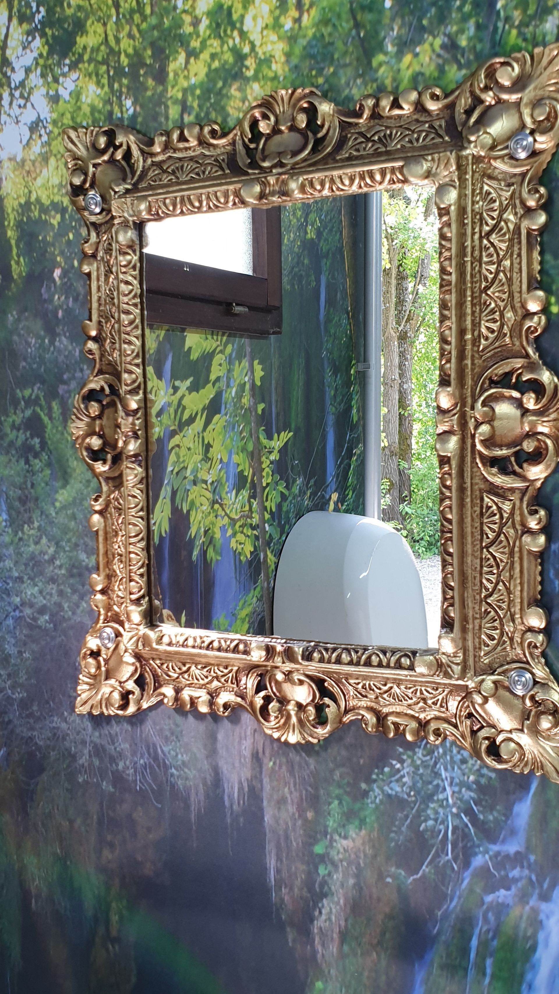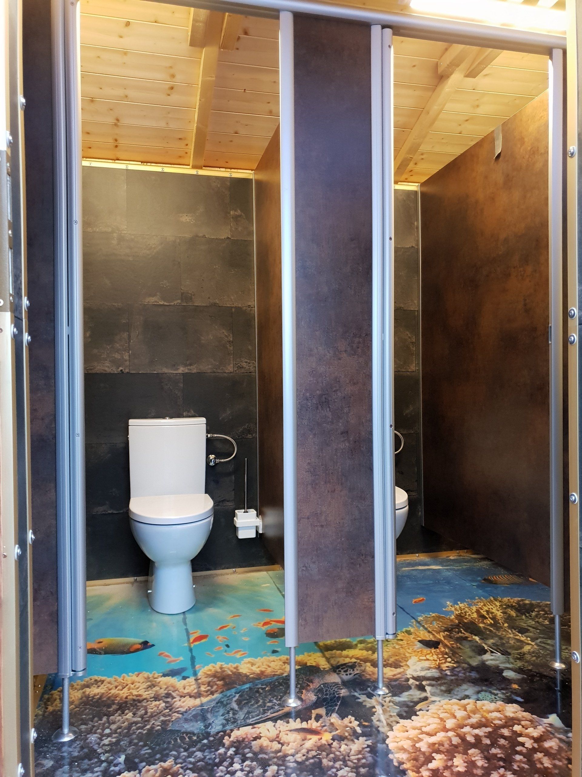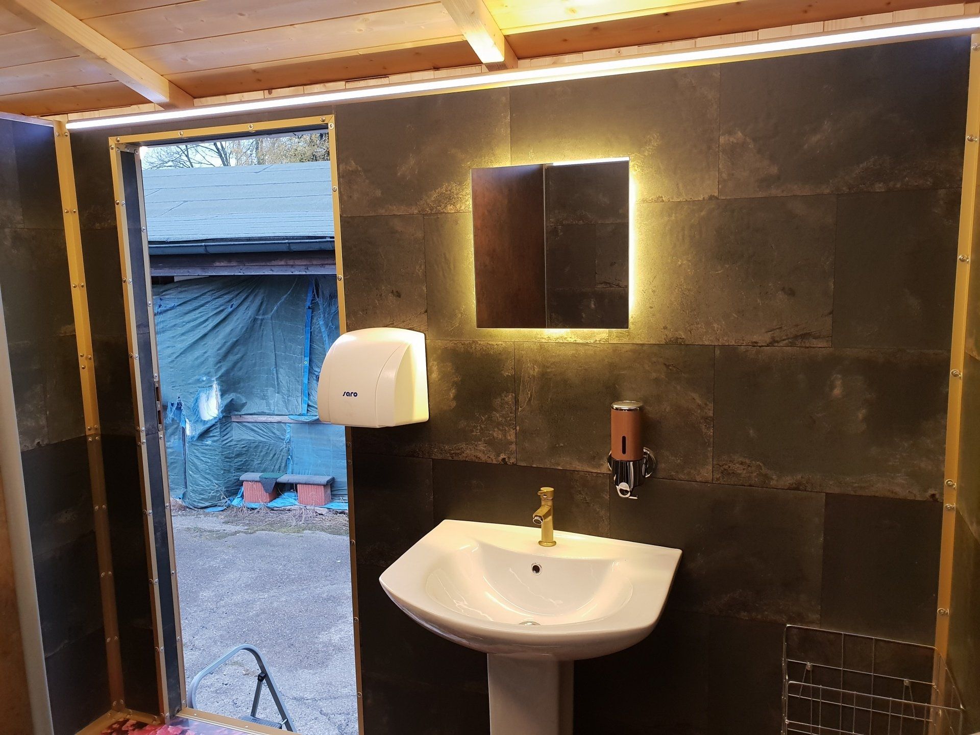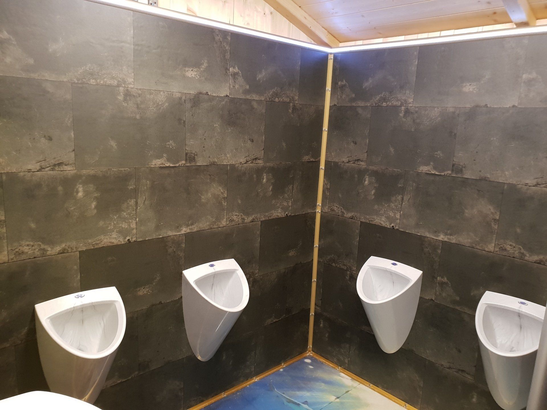 3 Damen-WC, 1 Herren WC, 4 wasserlose Urinale, Seifenspender, elektrische Händetrockner, beleuchtete Spiegel, goldene Wasserhähne